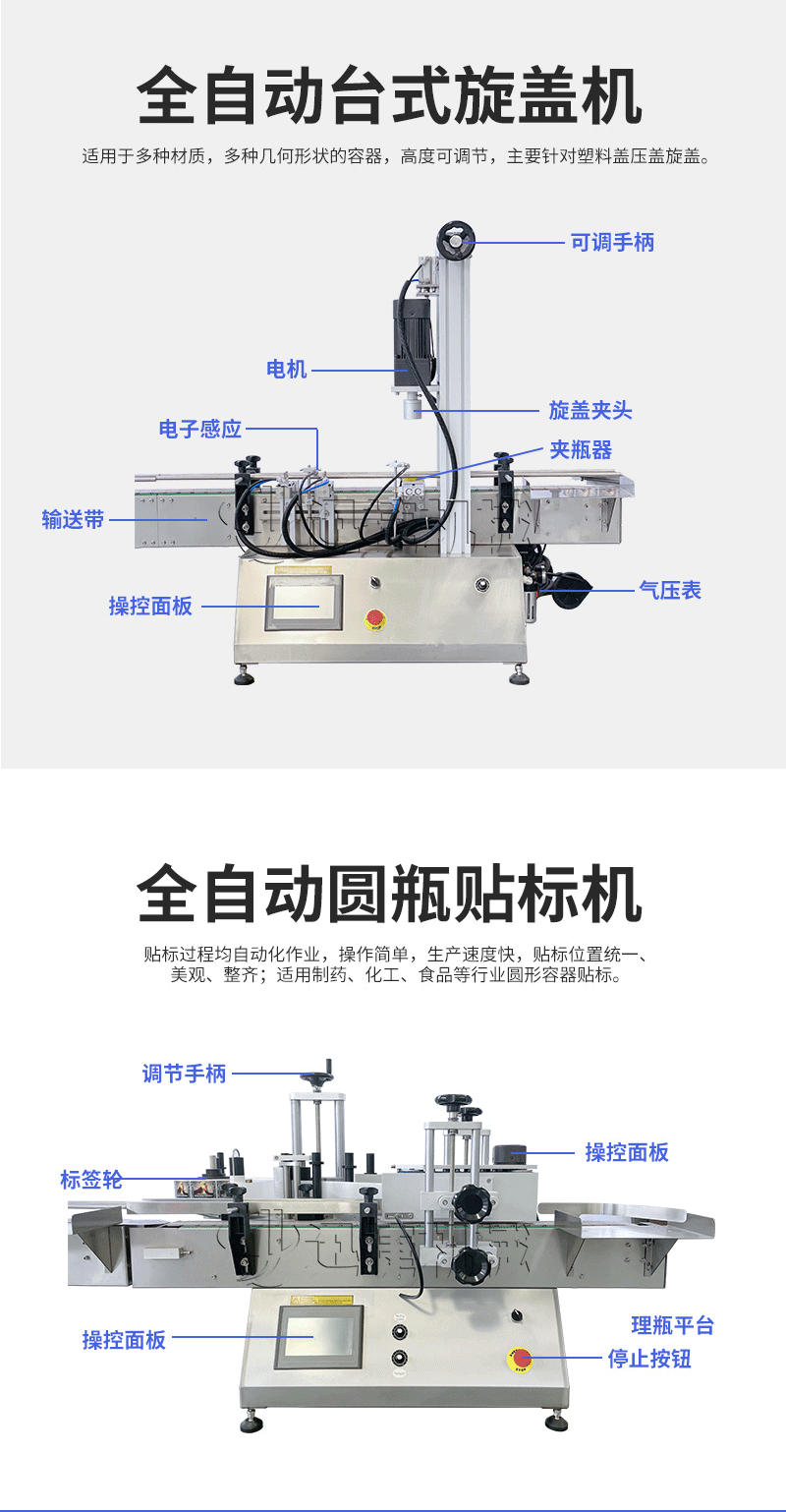產(chǎn)品說明:生產(chǎn)線根據(jù)灌裝范圍選擇型號,灌裝部分為雙頭下潛式灌裝機,適用于不同物料不同瓶子的灌裝,配備自動壓蓋機和圓瓶貼標(biāo)機,可實現(xiàn)不同蓋子的旋蓋貼標(biāo)工作。